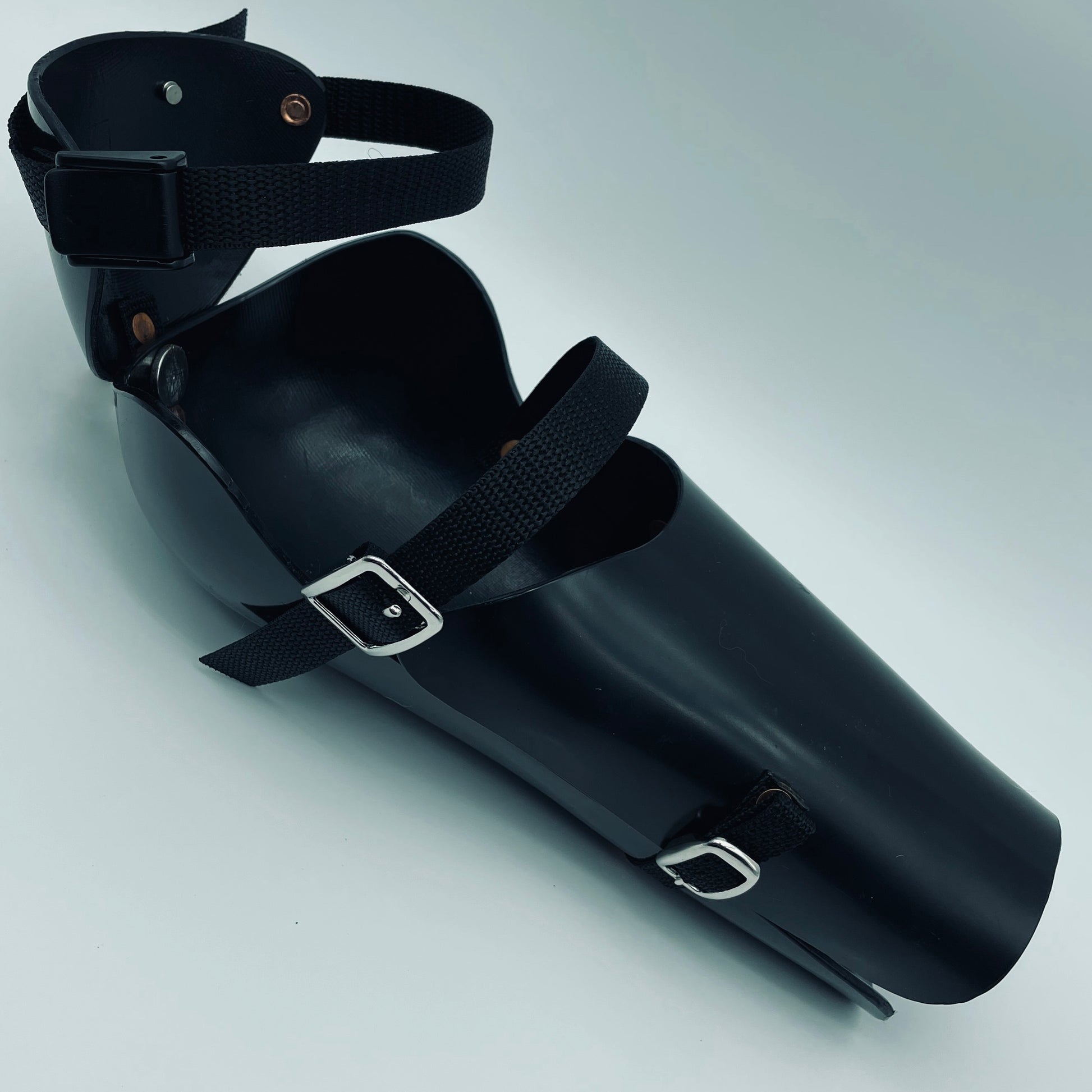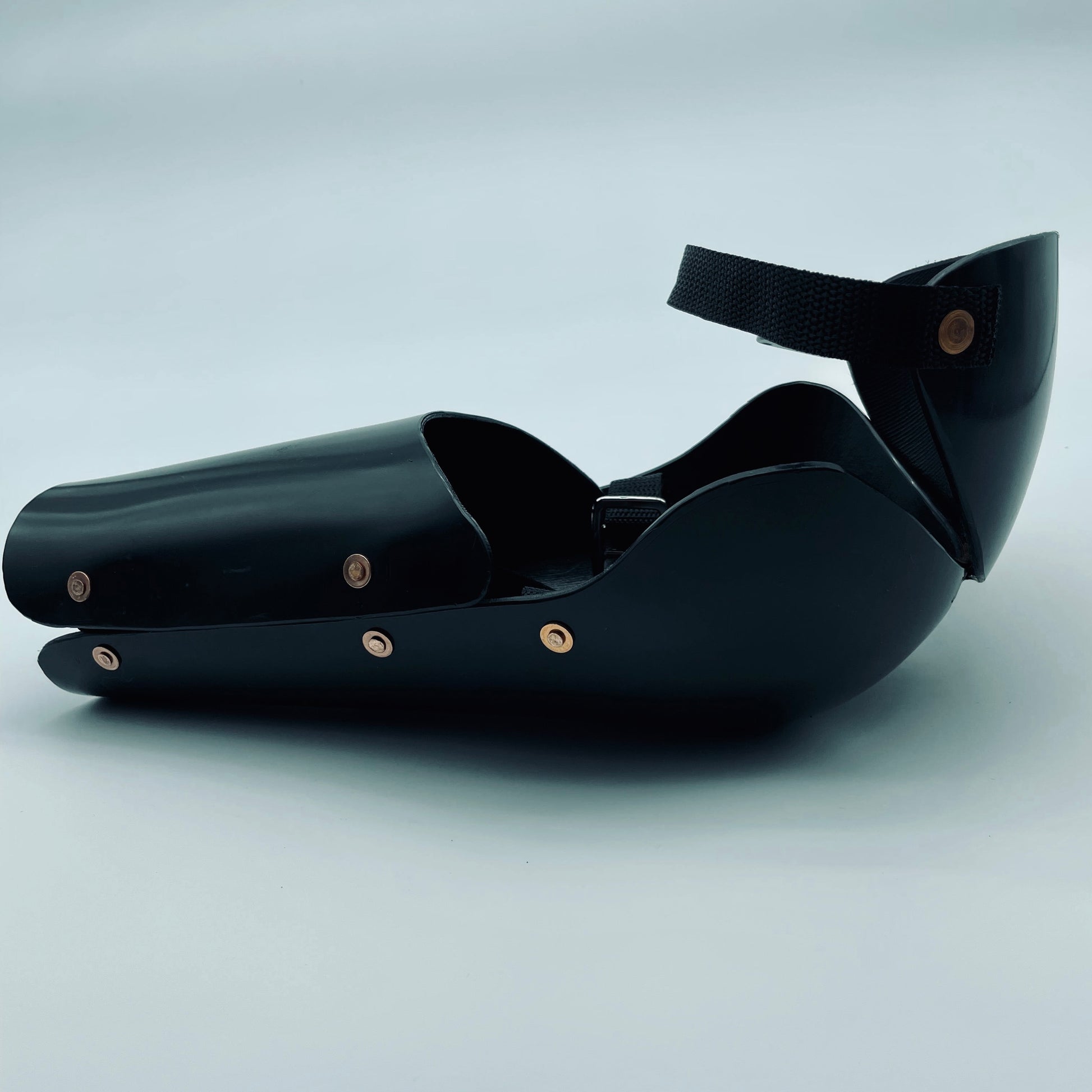 This piece includes a 1/8" HDPE plate to cover the inside of the forearm. It's hinged with webbing, and closed with a buckle or velcro, depending on your selection of strapping.