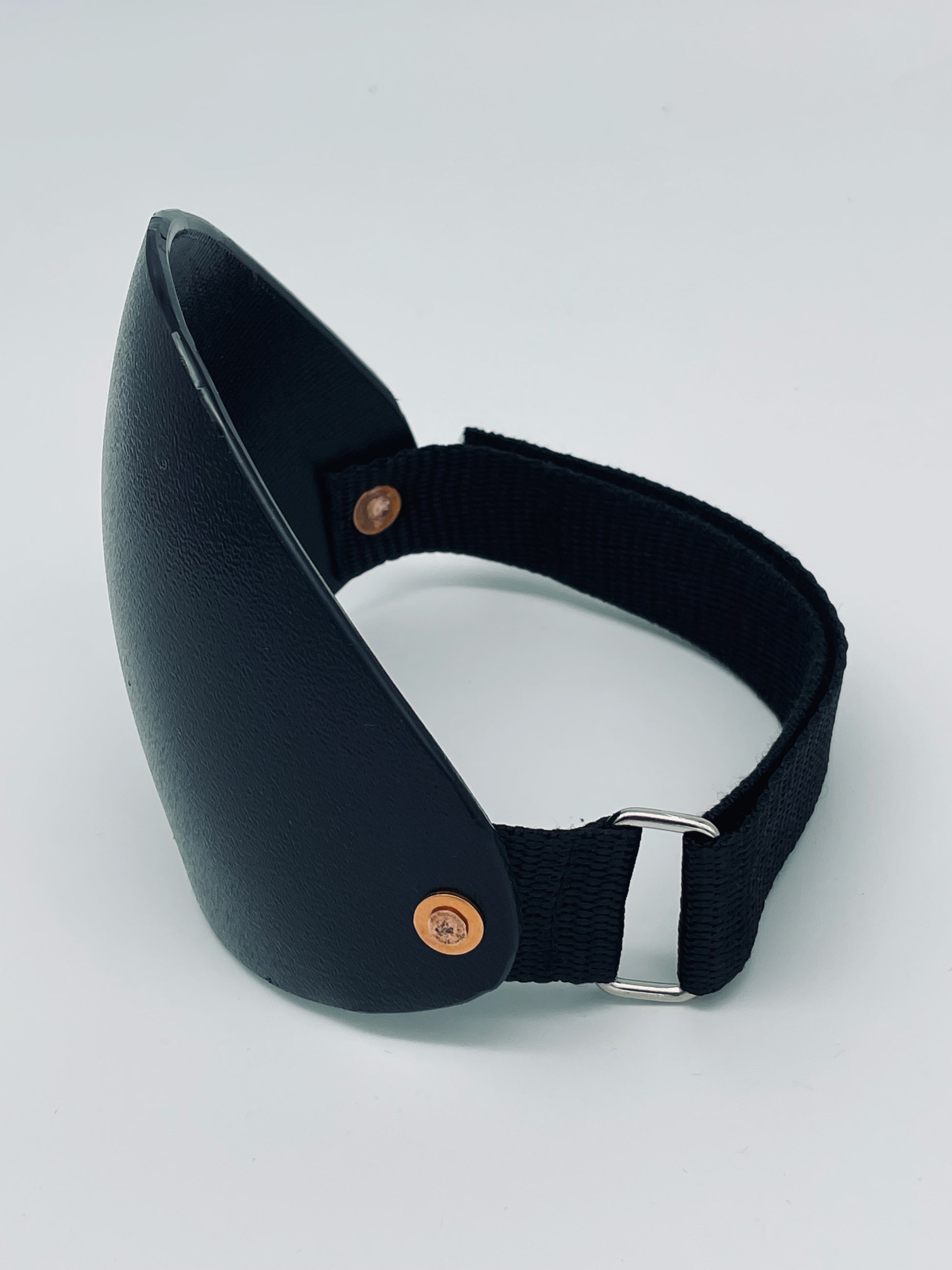 I prefer to use nylon webbing and a cam buckle to strap these around the arm. The plastic cam buckle is an excellent option, as it's often nice to wear the strap that goes across your bicep a little loose. The cam buckle allows for that, where a traditional metal buckle doesn't work as well. Velcro is another excellent option for strapping, but due to the time it takes me to sew the velcro straps, this option is more expensive. If you're dead set on a metal buckle, I offer that too.